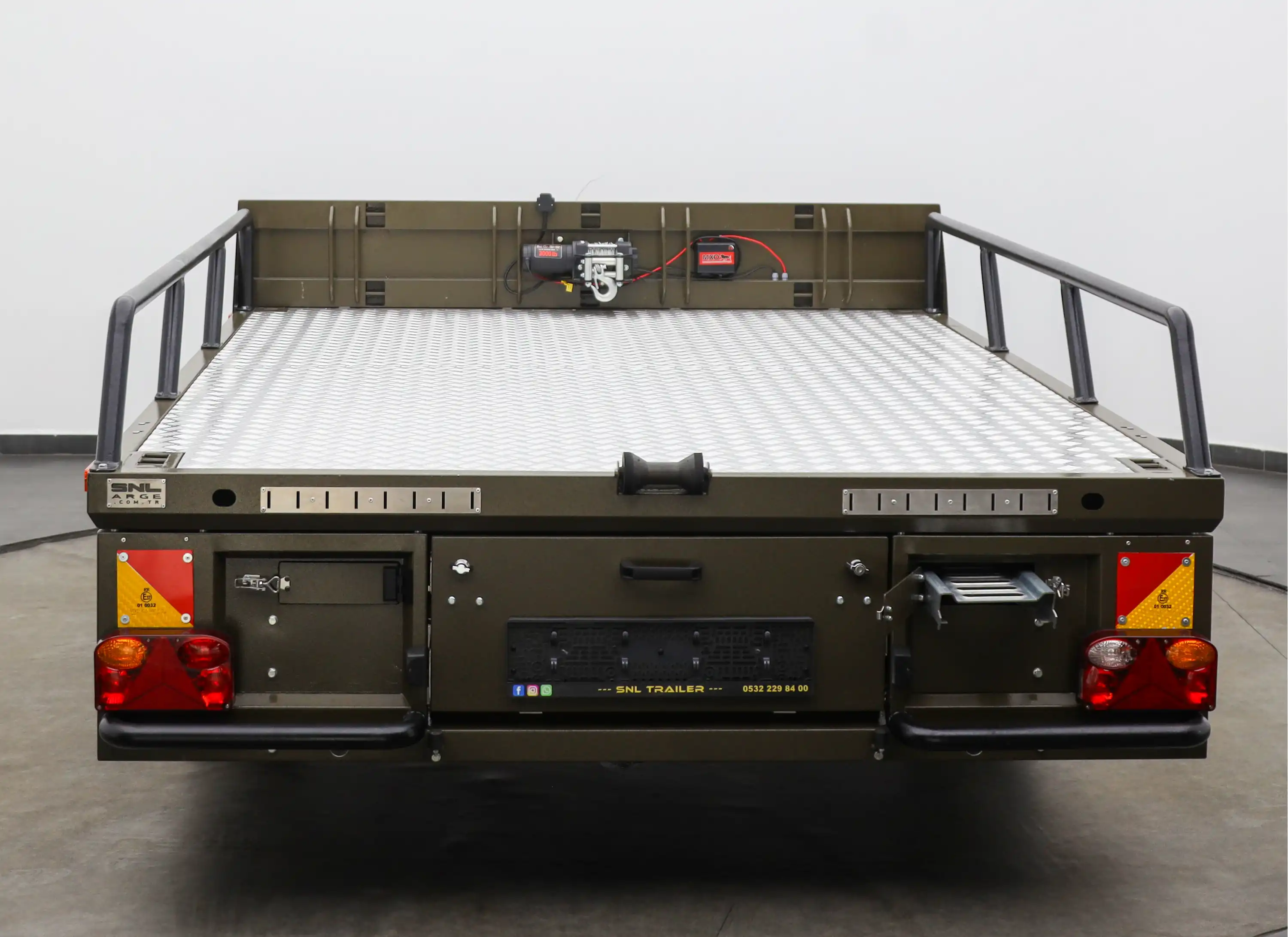 Sıcak daldırma galvaniz şase, alüminyum çeta kaplı marin taban ve AB standartlı fren/sinyalizasyon bileşenleri ile zorlu arazide dahi uzun ömürlü ve güvenli kullanım sunar. Frenli torsiyon dingil ve Knott kaplin kombinasyonu, yüksek yüklerde kontrollü sürüş sağlar.